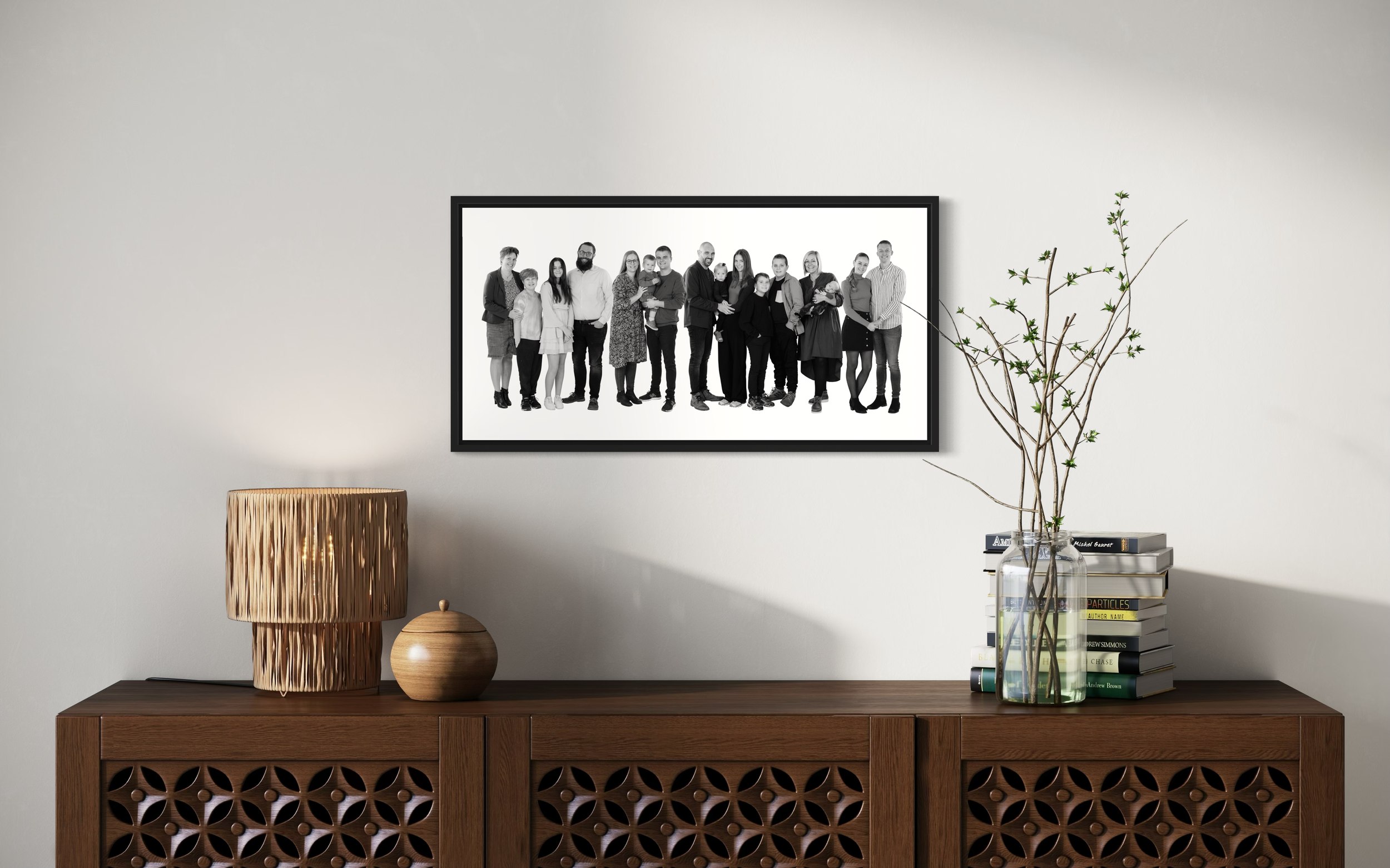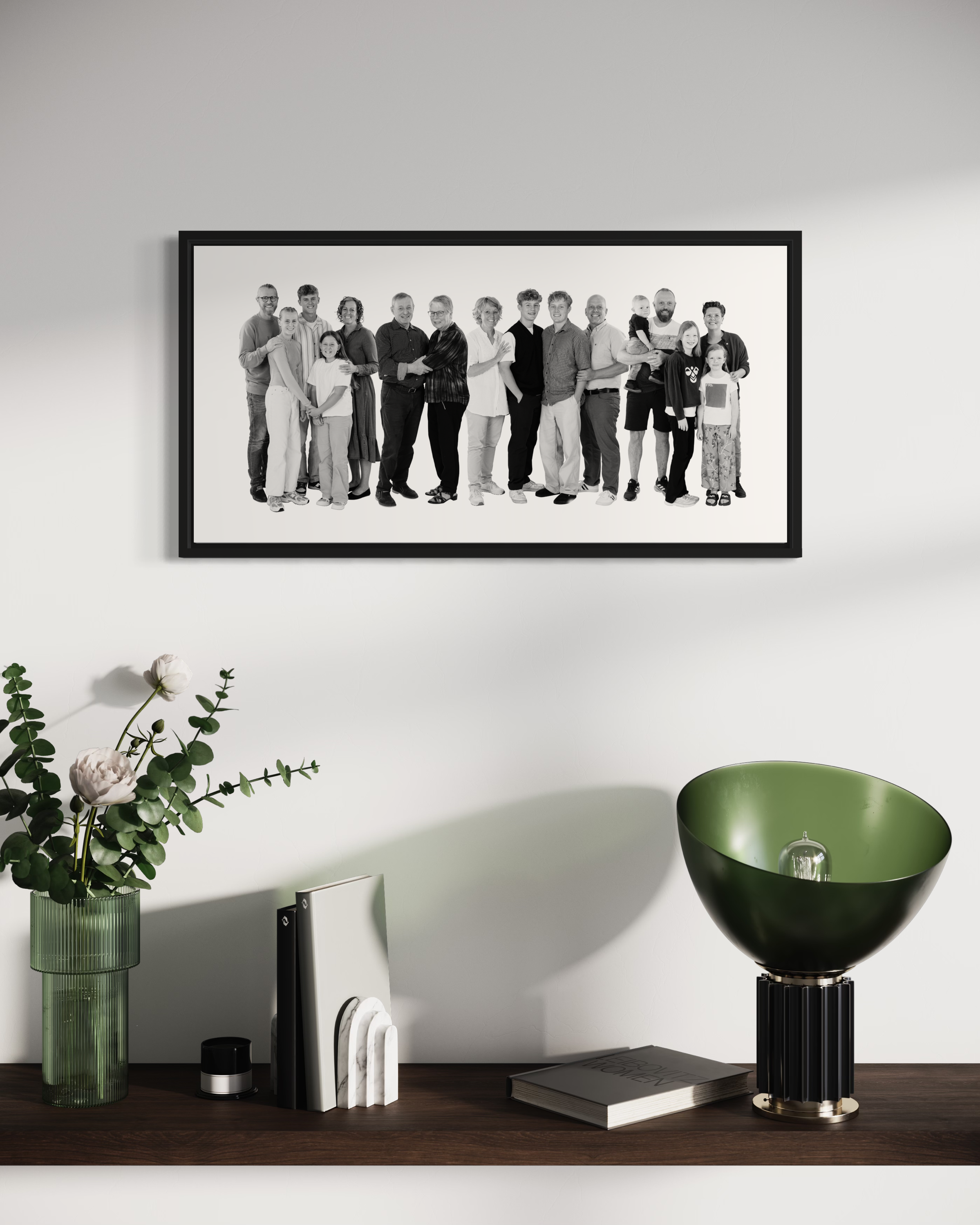 Har I en stor familie og kæmper med at få alle med på ét billede? Jeg har udviklet en særlig teknik, hvor jeg fotograferer familien i små grupper og derefter sætter dem sammen til ét smukt, stort gruppebillede.